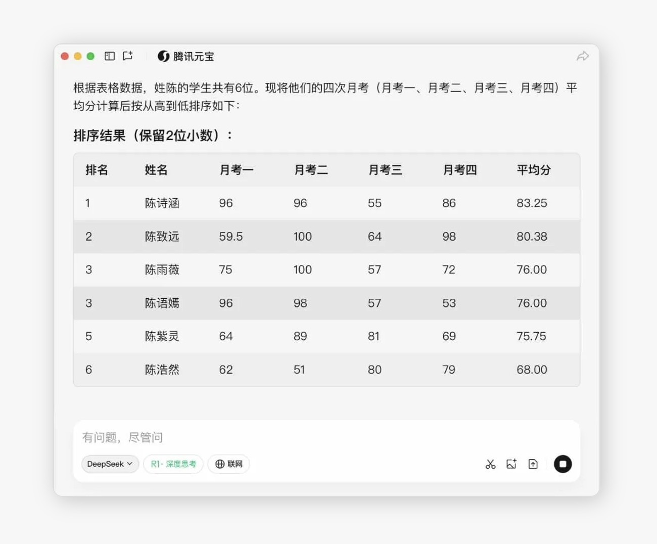今后,无论是预算表、成绩表,还是各类数据统计表,元宝都能根据提问快速理解并给出分析结果。