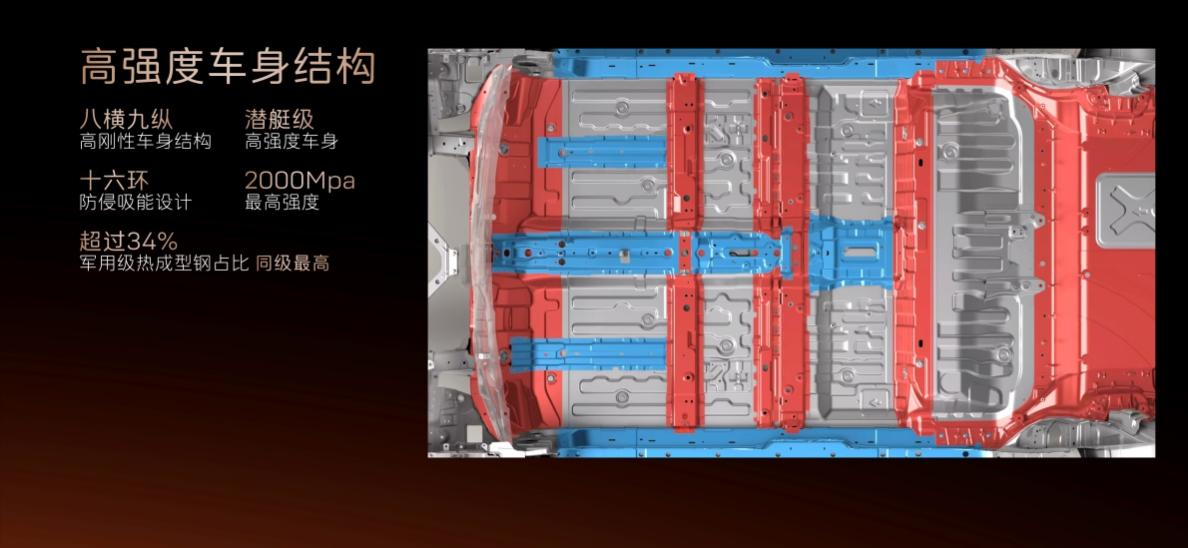 电池安全方面,电芯采用宁德时代AI 加强的第八代智能产线,累计通过150+项专项安全和性能试验,电池0起火0爆炸,达到了极高安全标准。此外,门槛梁采用全贯穿式六宫格铝型材和热成型钢三层外中内板组合设计,形成“三明治”式防护结构,外加热成型双拼座椅后横梁结构,组成三重防护结构,在遭遇冲击时高效保护电池。