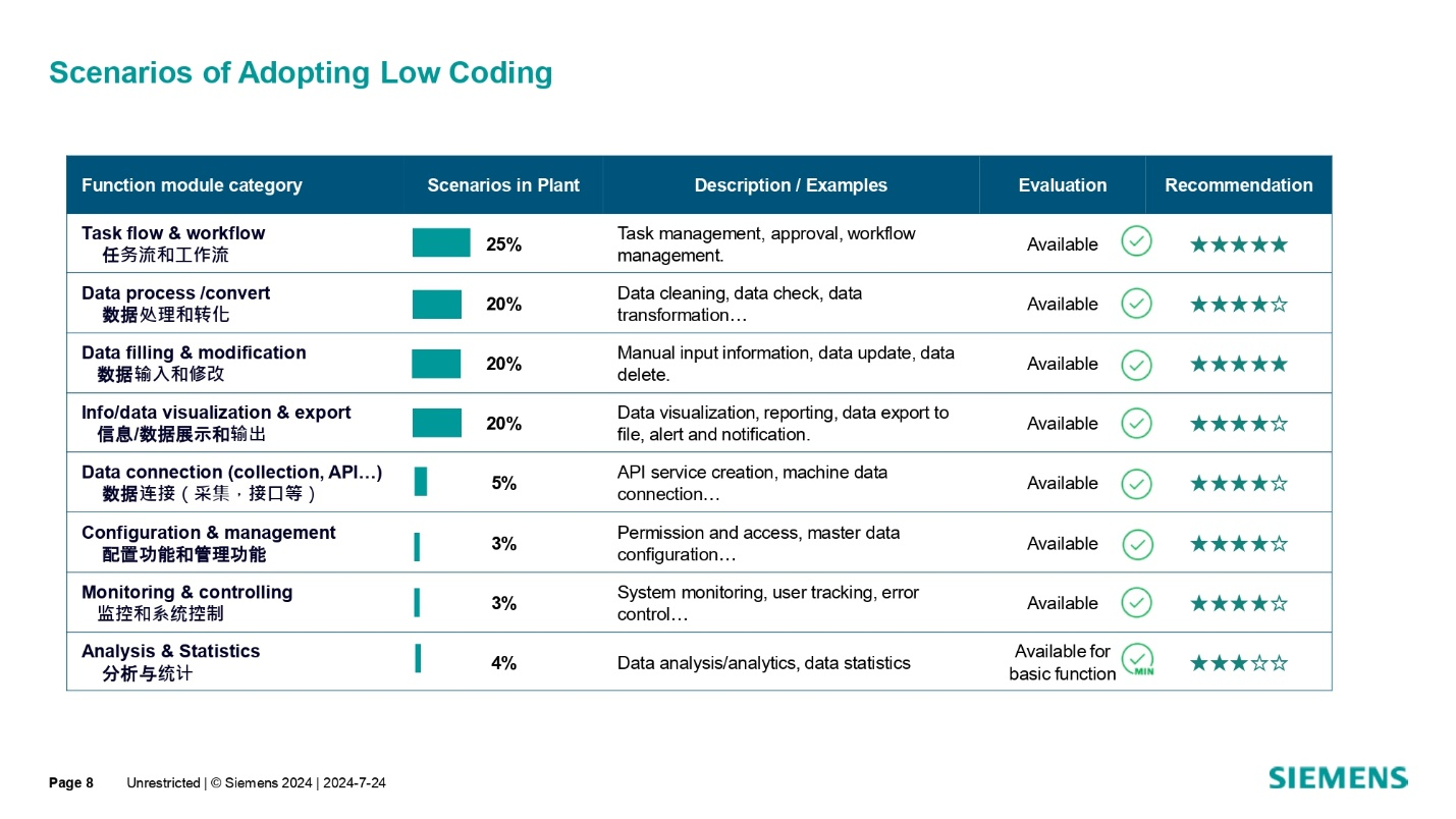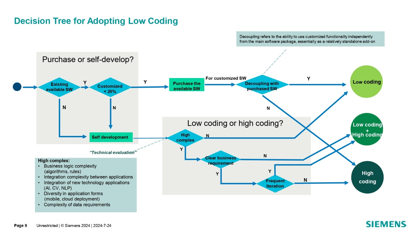 在选择低代码时,博世汽车电子事业部会根据业务复杂度、数据逻辑、算法规则、系统整合需求,以及是否需要使用先进技术(如大数据分析、机器视觉、AI 等)来决定是购买、自主开发还是以结合高低代码的方式进行。如果业务需求频繁变更,或项目处于探索阶段,低代码平台的快速迭代和变更能力使其比高代码更具优势。