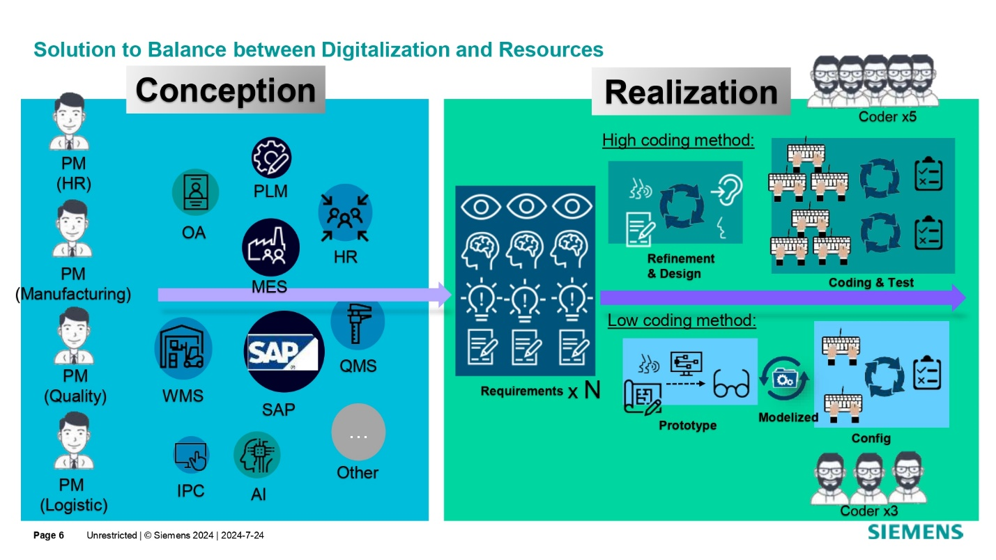 “在工厂里做软件开发,我们关注的是整个过程和其中的区别对比,而不仅仅是找到某个具体的解决方案。我们工厂有完整的数字化和软件开发团队,包括产品经理、项目经理、软件编码人员,软件测试等,每个职能部门,如人事、生产、质量、物流等,都会提出需求。在构思阶段,数字化对口人员会从业务人员那里得到需求。主要问题是针对需求的理解可视化,传统开发模式下,往往需要业务部门耗费很长的时间攥写非常详细的 PRD 文档,这个工作量巨大,且可能会持续数月之久,开发团队拿到这些需求后开始动手开发,直至开发团队完成系统的上线,这中间又需要历时数月,等到业务部门看到自己当初需求的系统时,往往可能已是半年之后,在这个时候业务部门的流程很大概率已经发生了微调或变化。”