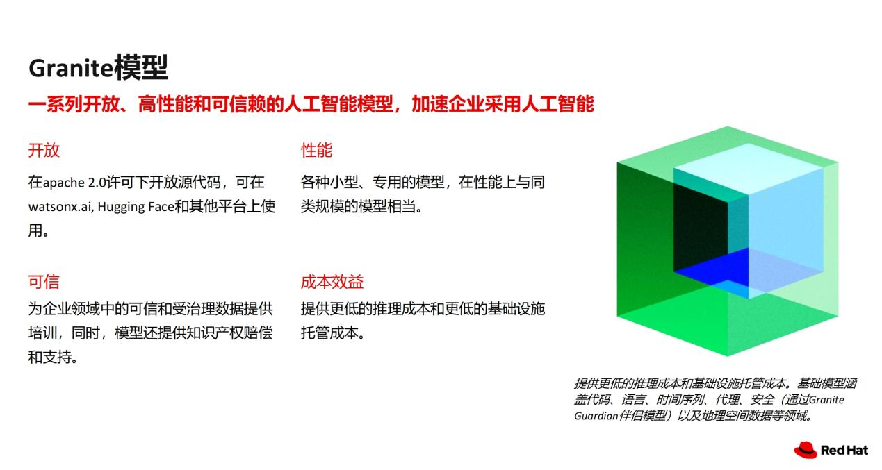 红帽自有的Granite模型在apache 2.0许可下开放源代码,可在watsonx.ai、Hugging Face和其他平台上使用。提供更低的推理成本和基础设施托管成本。基础模型涵盖代码、语言、时间序列、代理、安全,通过伴侣模型(Granite Guardian)以及地理空间数据等领域。