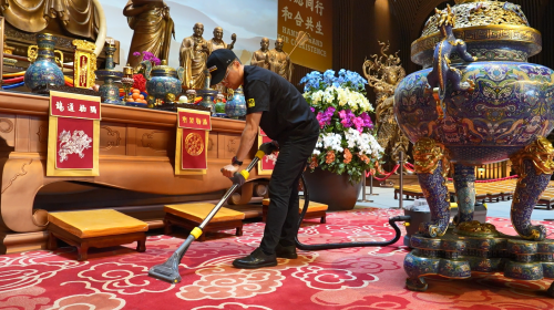 至于极易滋生细菌的地毯,清洁专家门则选用喷抽清洗机进行深层清洁。通过喷抽清洗,设备可在水和清洁剂进入地毯的同时,完成真空吸尘,从而在快速去除污渍的同时,对地毯进行干燥处理,即刻焕新。值得一提的是,卡赫清洁专家还为坐落于雪窦山脚下的弥勒圣坛内近2000张剧院式座椅提供了悉心的清洗服务。为了不影响前来参观圣坛的游客,卡赫团队首先用背负式吸尘器将附着在座椅表层的灰尘吸走,再搭配喷抽清洗机进行点对点、面对面的深层清洁。