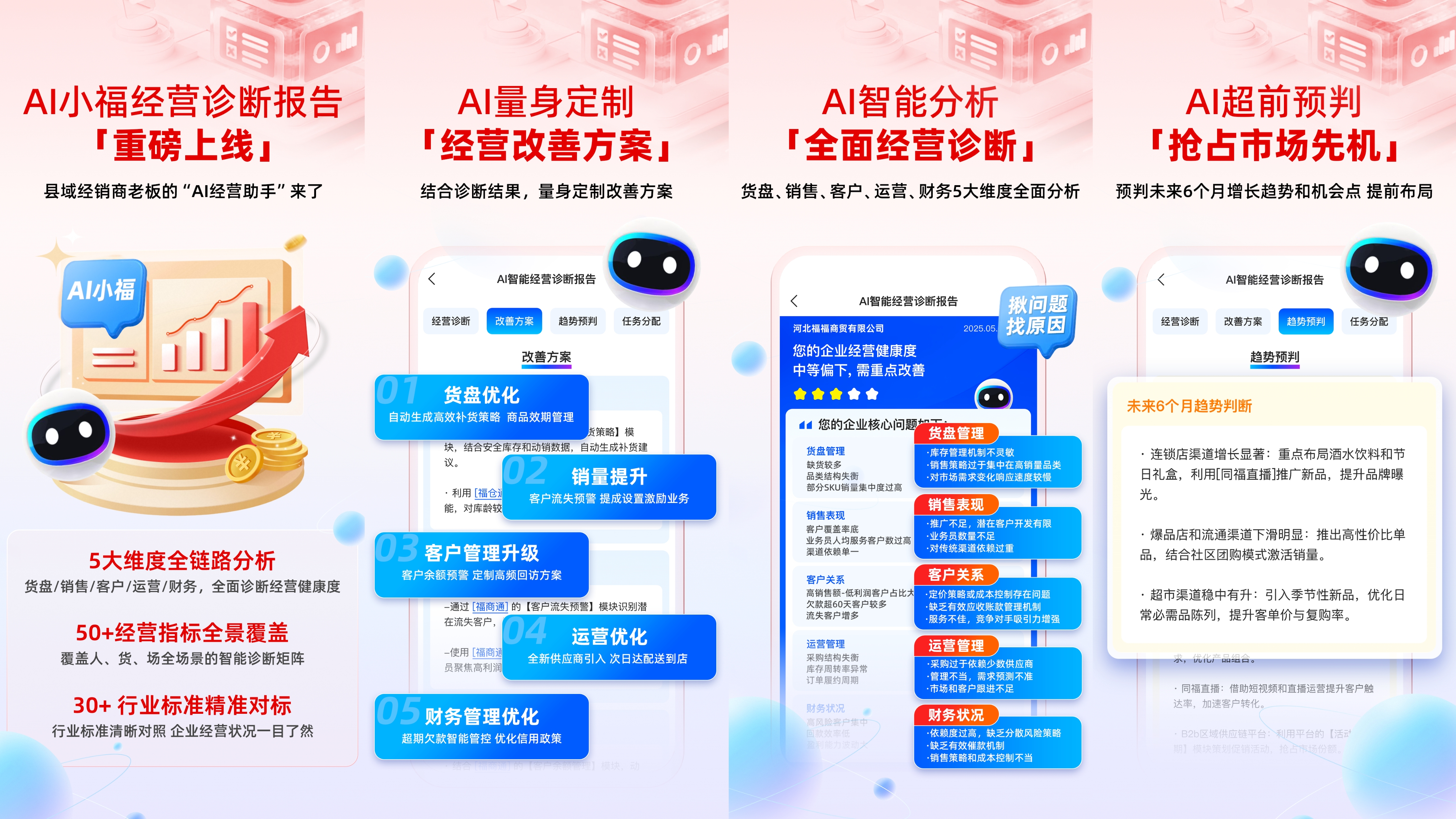 在诊断结果方面,AI小福可自动生成量身定制的个性化改善方案,为商贸公司执行决策提供科学依据。更值得一提的是,AI小福具备超前趋势预判能力,能够预测未来6个月的市场机会与增长点,助力经销商提前布局,抢占市场先机,在激烈的竞争中脱颖而出。