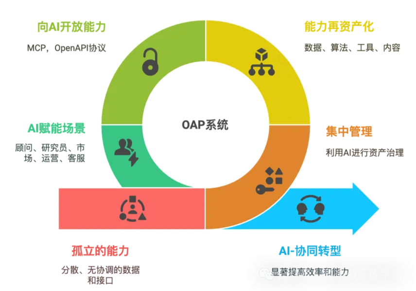对于什么是能力的“再资产化”?他进一步解释道,当前在企业内部其实存在大量分散、未协同的数据和接口,且形式各异、错综复杂。AI 协同转型的首要任务便是将这些孤立的数据和能力进行集中管理,并通过 AI 技术来实现快速、低成本的资产治理。
