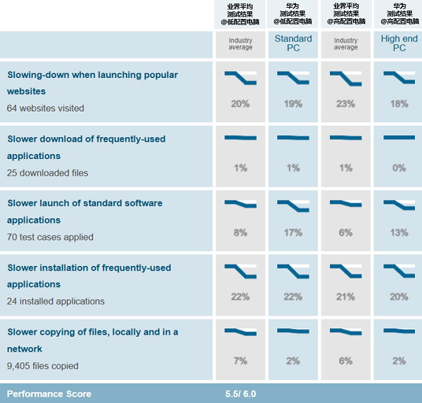 HiSec Endpoint在性能维度获得5.5分(满分6.0分)的评分。性能测试数据显示,HiSec Endpoint对日常操作的影响控制在极低水平:访问64个常用网站的速度延迟低于业界平均水平5%,25个应用程序的下载耗时接近0影响,拷贝9405个文件的速度影响率低于业界平均水平5%。HiSec Endpoint的CPU占用率稳定在1%以下,内存占用低于200MB,可在终端办公场景实现轻量无感防护。
