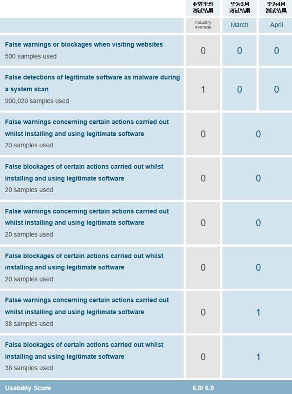 HiSec Endpoint在易用性维度获得6.0的满分评分。易用性测试表明,HiSec Endpoint在500个网站访问测试中实现零误报拦截,90万个合法程序扫描0误判。在20款企业级软件的安装使用过程中,未出现因安全策略导致的安装阻止。体现出产品具备极低误报率和高易用性。