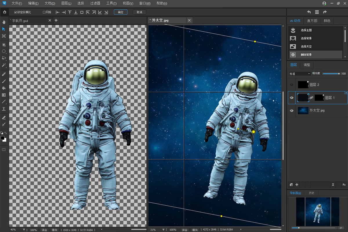 此外,软件新增的AI 动作与对象选择工具,可以通过简单笔触快速生成精准蒙版,大幅提升复杂场景的编辑效率。