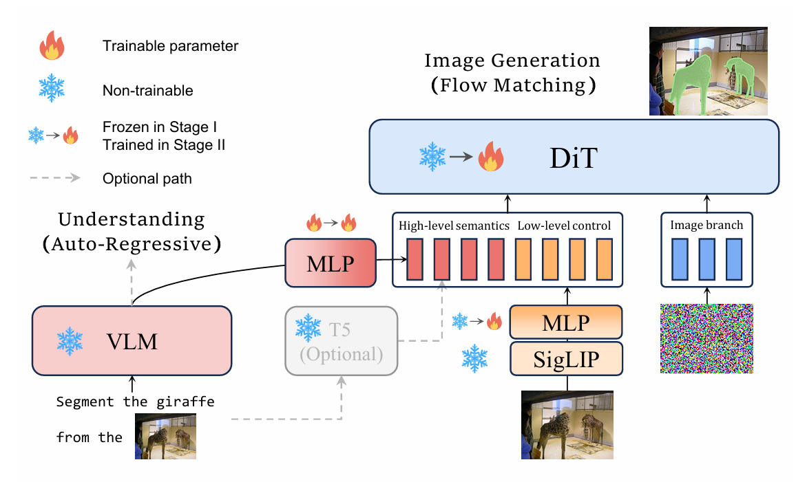 l 架构层割裂:图像生成通常依赖 VAE 或扩散机制,而视觉理解则依赖于独立的 encoder。这种架构上的割裂导致模型难以共享语义信息,增加了训练资源的冗余。