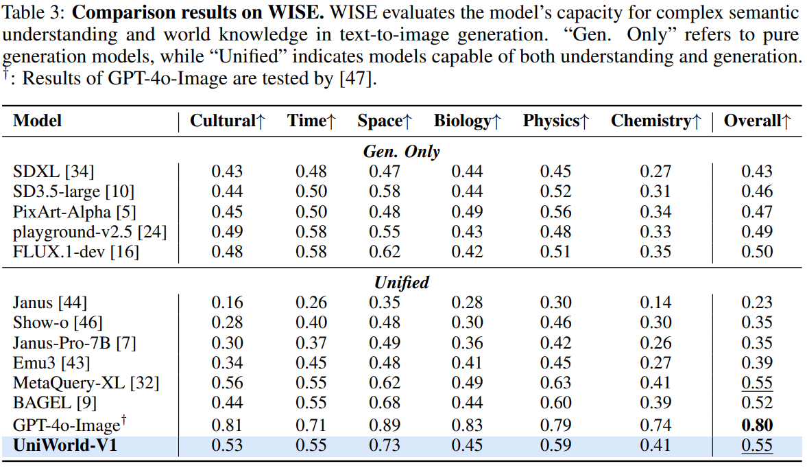拥有全视觉能力、理解与生成统一架构的 UniWorld V1,完整模拟人类右脑的核心能力,在文生图的世界知识理解WISE榜以及物体关系准确榜GenEval上超过全球知名图像生成模型FLUX,几乎所有指标均好于DeepSeek发布的大模型Janus-Pro。