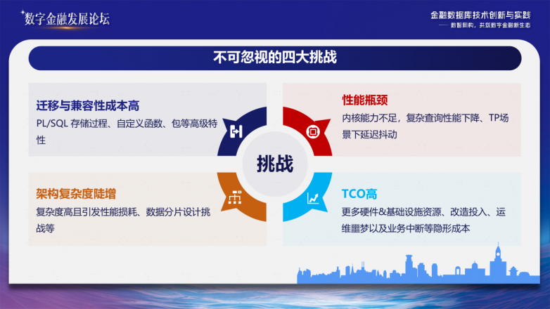 在演讲中,吴良智分享了对金融关键业务系统规模化替代技术路径的理解。他指出,当前的解决方案虽有积极探索,但与规模化复制仍有一些差距,当前有四大不可忽视的挑战。