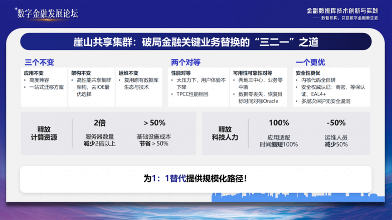 如何去比较好的解决上述提到的痛点呢?吴良智指出,我们是希望能够通过“1:1平替Oracle”的方式去实现规模化复制。这里说的“平替”是指“平滑替换”,是兼容性、功能、性能、高可用、运维的全面平滑替换,而不仅仅是兼容和功能的平滑替换,更不是很多人理解的“平价替换”。这有根本的区别,因为后者很容易让客户先入为主产生低价替换的认知。