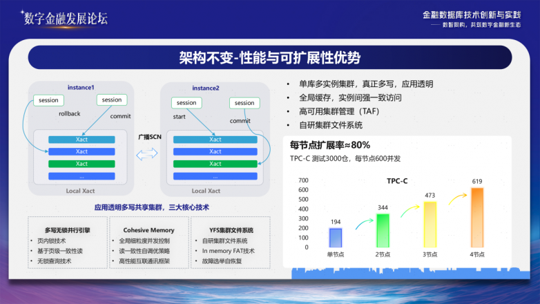 性能决定了方案能否支撑核心业务,并直接影响替代成本。在性能方面,YashanDB原创性地采用细粒度多版本并发管理机制、自适应异步事务调度、全局资源运行时调度、去中心化事务管理等技术,突破分布式数据库硬件依赖瓶颈,在TPC-C测试中,其4节点集群性能达618万tpmC,单节点扩展比超70%,这意味着每秒可以承载数千笔交易,可满足大多数金融机构关键系统的业务处理要求。