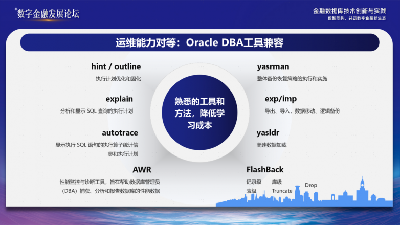 最后是在运维层面,崖山数据库提供从技术兼容、智能工具到知识赋能的完整解决方案,如DBA熟悉的Oracle运维利器如Hint/Outline、AWR报告、yasrman (类比RMAN)、exp/imp、FlashBack等均得到支持,Oracle DBA 技能实现平迁,大幅降低原有技术团队学习曲线和运维切换成本。