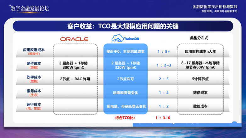 吴良智认为,目前,关键业务系统替代更多还是国有大行等大企业先行尝试,中小企业还不敢贸然在核心系统替换上迈出太大的步子。只有规模平替,才能让中小企业在高端场景也用得起、用得上、用得好数据库。崖山共享集群在综合成本(TCO)方面的显著优势,成为破解这一局面的关键突破口。以共享集群为核心的解决方案,凭借“1:1替代”技术路径,打破了传统国产化方案依赖“业务重构与高额改造成本”的困局,从应用改造、软硬件投入、基础设施资源消耗到服务支出实现全面降本,至少释放50%以上的成本,让更多的资源可以投入到业务创新。