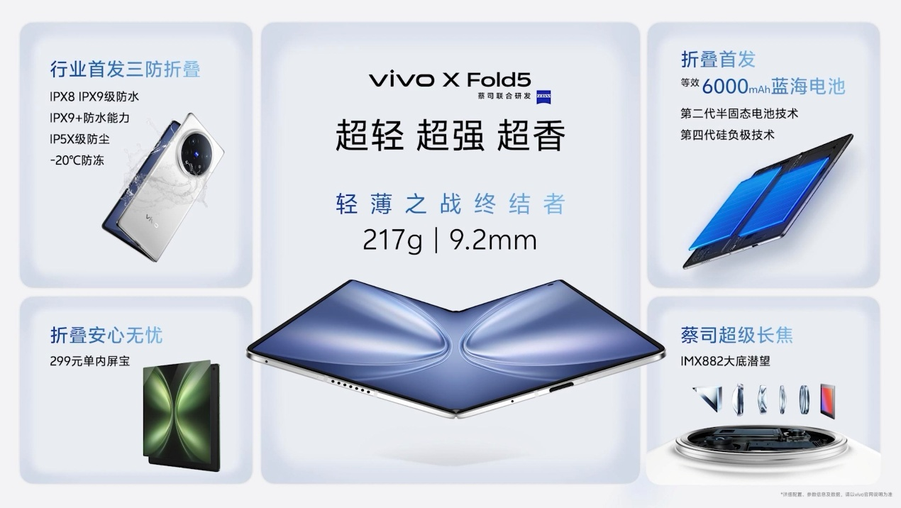 2025年6月25日,vivo正式发布新一代折叠旗舰vivo X Fold5,机身轻至217g,打破了vivo上一代折叠屏X Fold3保持的219g全球最轻纪录,再一次定义大折叠机型轻薄新标准。