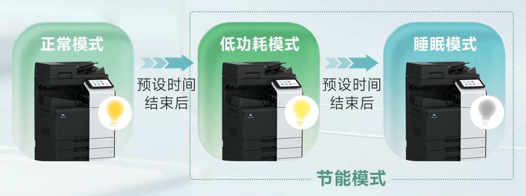 柯尼卡美能达旗下数码复合机均可实现"节能模式”,该模式可使数码复合机自动进入节能状态以有效降低闲置设备的能耗。例如:当数码复合机持续闲置达到预设时长时,控制面板显示屏将自动关闭。数码复合机在节能待机状态下若接收到电脑打印或传真信号,将即时恢复至正常运行模式。