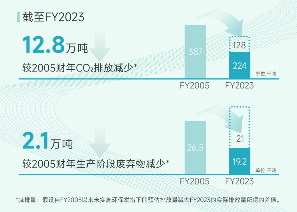 截至2023财年,受益于绿色工厂建设,柯尼卡美能达集团较2005财年总计减少CO₂排放12.8万吨,生产阶段减少废弃物2.1万吨,节能减排成效显著。