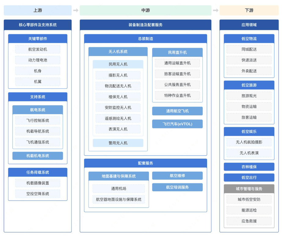 中国低空经济产业链上游为原材料与核心零部件领域,其中原材料包括金属原材料、特种橡胶与高分子材料等;产业链中游低空经济行业包含低空制造、低空飞行、低空保障与综合服务;产业链下游为各种应用场景,包括旅游业、物流业、文旅业与巡检业等。