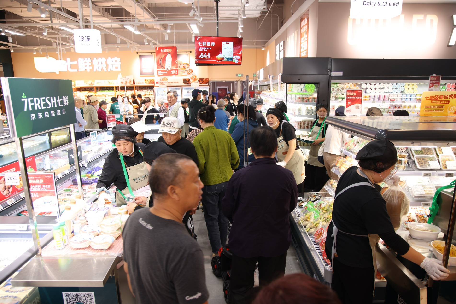 海鲜水产区亦是人流如织。源头直采的鲜活大闸蟹、俄罗斯黄金帝王蟹、大海白虾、厚切三文鱼等商品备受青睐。顾客王先生表示:“知道京东七鲜今天开业,我一早就赶来,准备先抢海鲜区的帝王蟹,再买些孩子喜欢的烘焙新品,最后挑选月饼礼盒。这个国庆节打算带孩子回河北老家,正好采购一些高品质食材。”