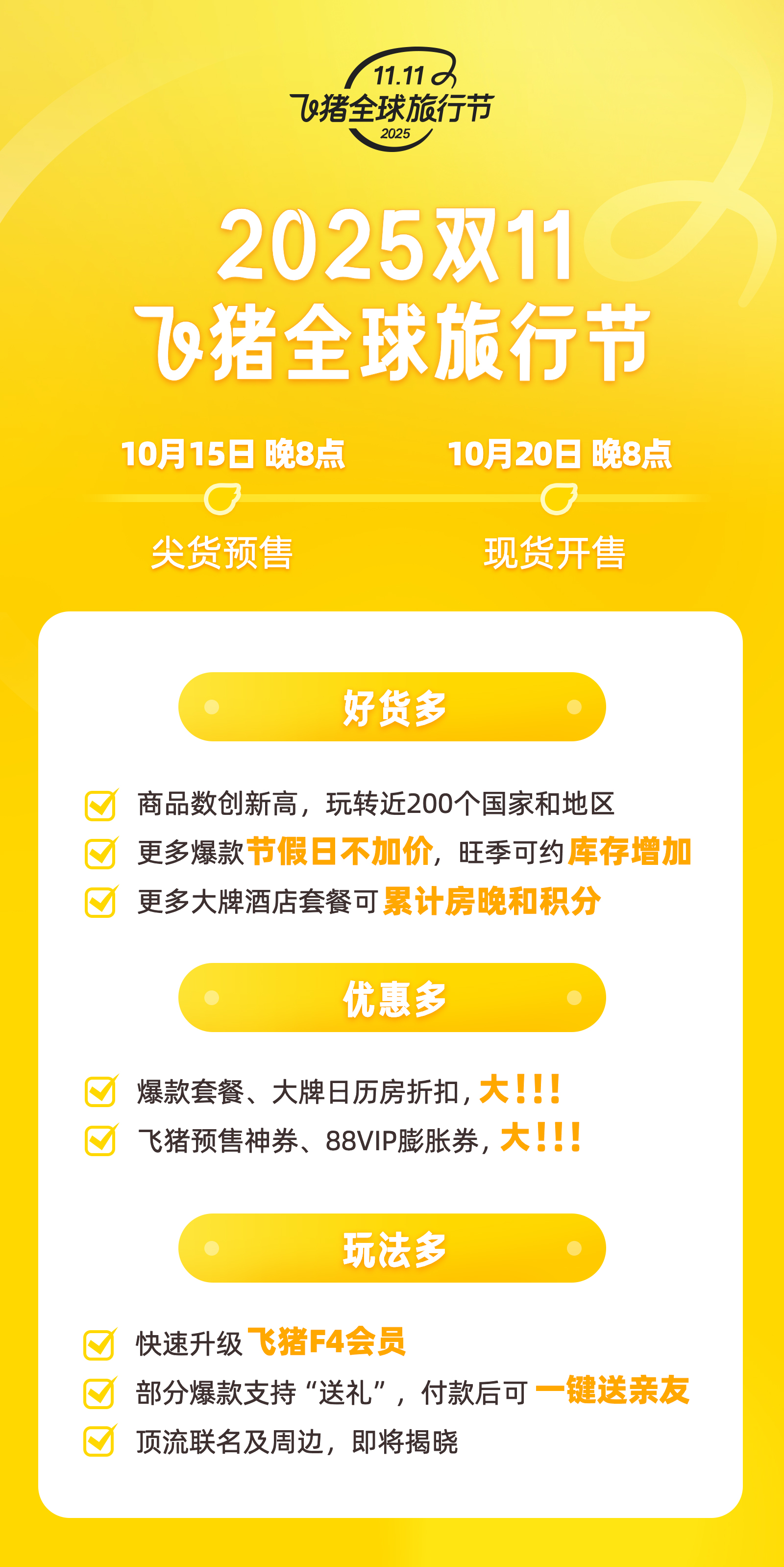 【赛迪网讯】10月15日消息,飞猪宣布2025年双11全球旅行节启动,其中尖货预售于当日晚8点开始,全量现货将于20日晚8点开始。