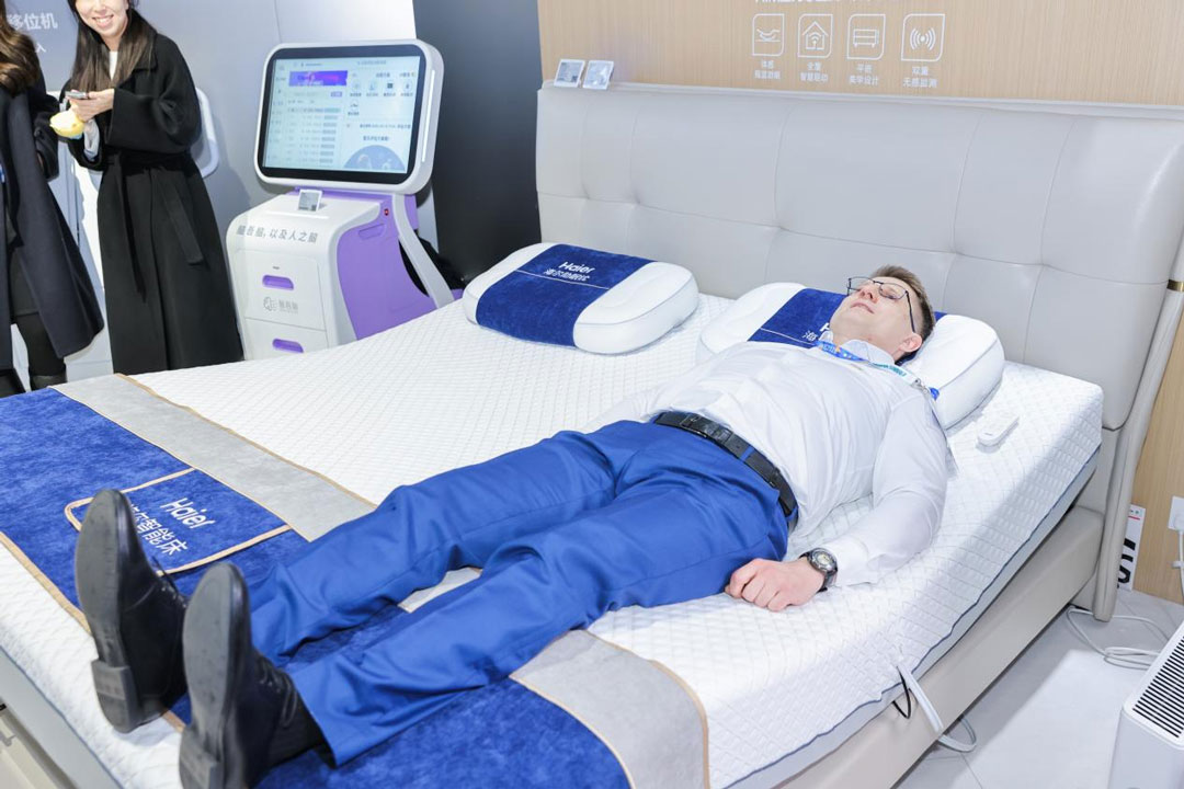 围绕银发长者的日常生活需求,自2022年入局适老产业三年多来,海尔智慧康养通过整合全球资源陆续构建了睡眠、卫浴、出行、健康、康复五大智慧场景。本次展会现场,这些场景的完整呈现,让参观者仿佛置身于未来的智慧养老社区,零距离感受科技带来的温暖与便捷。睡眠场景中,海尔天悦智能床成为焦点。其搭载AI双重无感体征监测技术,可实时捕捉心率、呼吸等数据,零重力模式促进下肢血液回流,智能助起功能让长者轻松起身下床。现场观众纷纷躺下体验“摇篮哄睡”与“柔性助起”的贴心呵护,感受科技守护下的安心睡眠。
