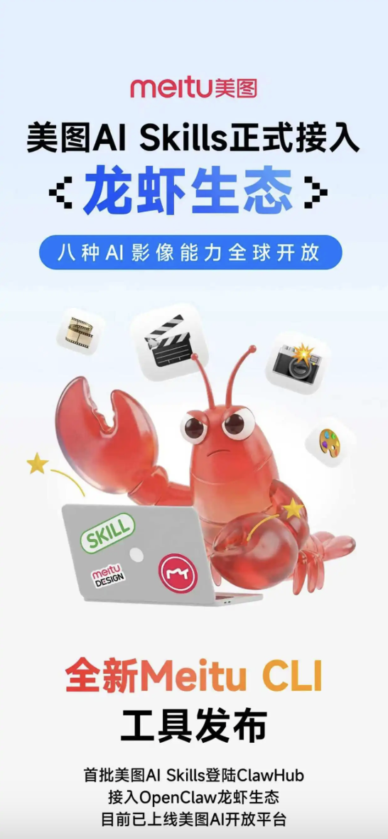 【赛迪网讯】3月24日消息,美图AI开放平台发布全新Meitu CLI工具,首批美图AI Skills登陆ClawHub,接入OpenClaw龙虾生态,覆盖个人与企业场景,所有OpenClaw用户均可直接安装和使用。