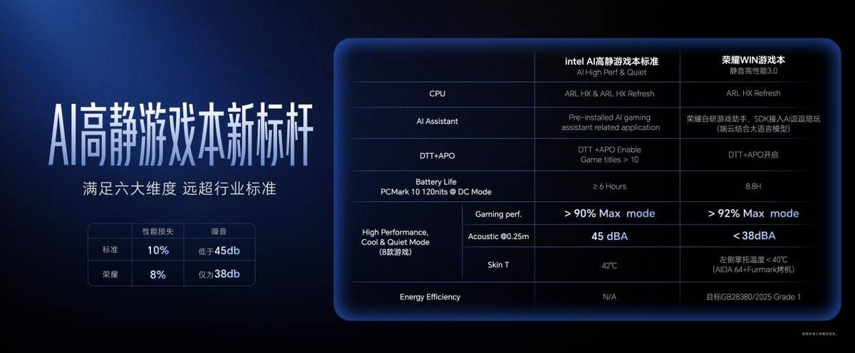 荣耀自研静音高性能模式3.0,畅玩3A大作噪音低于38dB,实现狂战性能与图书馆级静音的完美平衡,六大维度超越行业标准,真正做到“高能不吵人”。