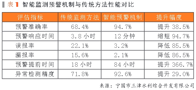 基于12个月连续运行数据的统计分析显示,智能监测预警机制在关键性能指标上实现了显著提升(见表1)。系统累计处理预警事件347次,其中准确预警329次,成功避免了16起潜在安全事故,直接经济效益达到4.2亿元。预警响应时间从传统方法的平均3.8小时缩短至12分钟,为应急处置争取了宝贵时间。通过对比分析发现,智能预警机制在复杂工况下的适应性明显优于传统方法,特别是在汛期高水位运行和设备老化等挑战性场景中,预警准确率仍能保持在90%以上的高水平。误报和漏报现象得到有效控制,系统稳定性和可靠性显著增强。