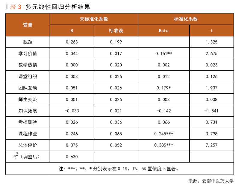 因变量为实验教学成效,对应问项为“本次公共管理虚拟仿真实训效果明显,提高了我的团队协作能力、决策能力,有利于理论与实践相结合”。自变量为SEEQ量表的九大维度,在变量计算上,“课程作业”和“总体评价”未采取加和计算方式,而是通过“课后作业有助于课程理解”和“实训优于理论授课”来表征。回归结果见表3。