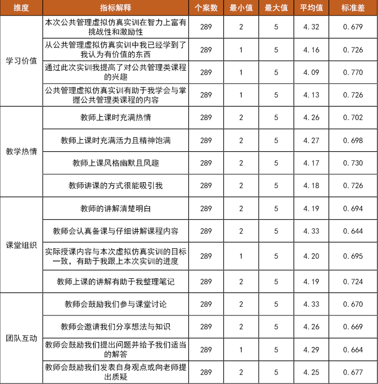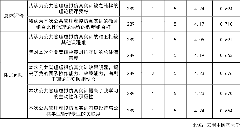 相较于传统理论教学,虚拟仿真实训能显著提升学生公共决策能力与理论转化效能,学生对虚拟仿真实训的学习价值感知、课程作业设计、团队互动、总体评价是影响公共管理虚拟仿真实验教学成效的关键变量。