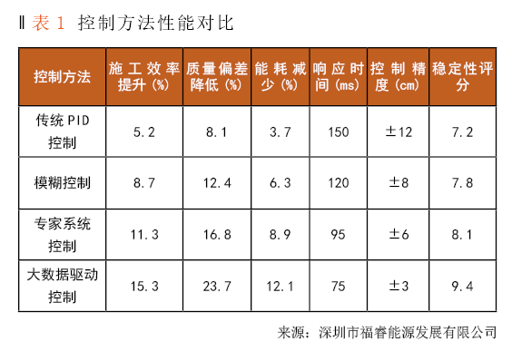 通过开展对比实验来评估大数据驱动控制方法与传统PID控制、模糊控制、专家系统控制等经典方法之间的性能差异。从表1能够看出,大数据驱动控制在施工效率、质量稳定性、能耗控制等方面都实现了显著的改善,施工效率提升了15.3%,质量偏差降低了23.7%,设备能耗减少了12.1%。对比分析的结果表明,大数据驱动控制方法可以更好地适应复杂多变的施工环境,通过智能学习与优化来实现施工过程的精准控制。评估结果验证了该控制技术在电力工程机械化施工当中的实用价值与推广前景。