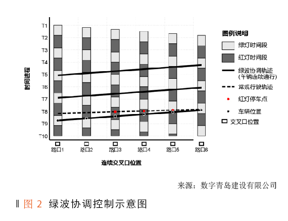 实时交通信号协调优化控制技术运用预测控制理论,构建涵盖绿信比、周期时长、相位差等关键参数的多维控制框架。控制算法通过遗传算法和粒子群算法求解最优信号配时方案,有效平衡各方向交通流的通行需求;分层协调架构在单点信号控制基础上实现区域信号的协调管理;绿波协调技术通过优化连续交叉口的信号配时参数,实现车辆通行轨迹与绿灯时间窗口的协调匹配(如图2所示)。