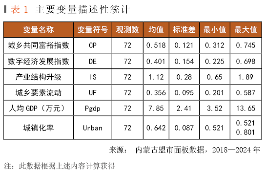 本研究基于内蒙古2018—2024年城市面板数据,构建城乡共同富裕评价体系,从“共同”与“富裕”两个维度选取城乡收入比(反向)、农村居民可支配收入、城乡公共服务均等化等指标,采用熵值法合成城乡共同富裕指数。核心解释变量为数字经济发展指数(DE),涵盖数字基础设施(如万人基站数、互联网用户)、数字产业(信息技术服务业营收占比)和数字技术应用(企业网站拥有率、农产品网络零售额),同样通过熵值法计算。中介变量包括产业结构升级(IS,以第三产业与第二产业增加值比表示)和城乡要素流动(UF,含人口流动率与存贷款差异度)。控制变量选取人均GDP、财政支出、城镇化率及生态约束指标。为考查非线性关系,研究将数字基础设施设为门槛变量,分析其对共同富裕的影响机制。
