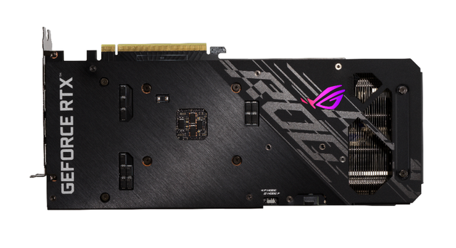 同时,该卡还配备了一个可以保护PCB的金属背板,有效防止 PCB 弯曲,保护内部组件和电路。为了适应全新安培GPU带来的更高频率,背板上还配有通风口,可以使散热能效升级。热空气通过通风孔流向底部排气风扇迅速排出,减少在GPU内部循环的热气。