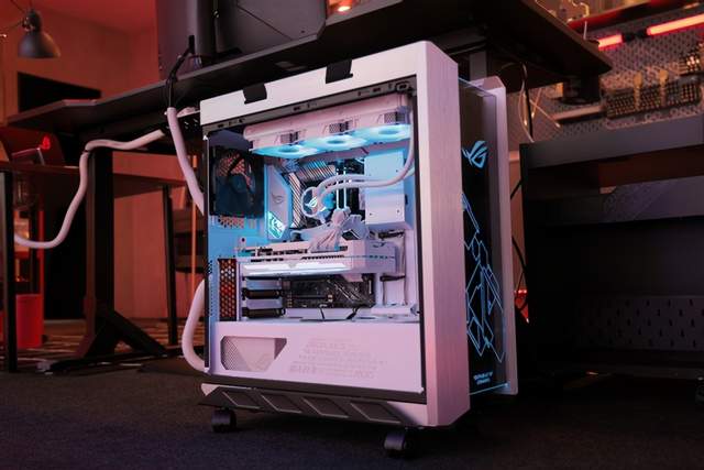 其中最引人注目的是配色明亮的ROG STRIX GeForce RTX™ 3080 WHITE显卡,纯白优雅的配色设计,助力玩家打造白色主题的电竞硬装。这款显卡的性能超群,可为游戏玩家和创作者带来令人惊叹的视觉效果、惊人的高帧率和AI加速功能,4K游戏更是手到擒来!同时, ROG STRIX HELIOS太阳神白色版机箱也凭借白色的配色吸引了不少玩家们的目光,搭配ROG STRIX LC小白龙RGB一体式水冷散热器,和ROG STRIX 雪鹰850W金牌全模组电源,带来了白色全家桶的高颜值组合,深受玩家们的喜爱!