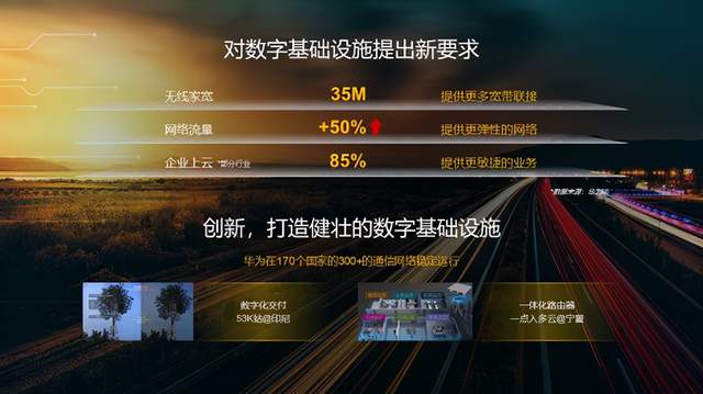 这些新的变化需要更健壮的数字基础设施来进行满足,而要做到这一点,技术创新是必不可少的。在过去的一年里,我们用创新的技术和服务,与我们的客户一起保障了全球170多个国家的300多张网络稳健运行。举两个例子,在宁夏,我们采用了创新的一体化路由器,实现了一个设备接入多个云服务,满足了疫情期间企业以更低的成本,更快的速度上云的需求。在服务创新上,在印尼,基于全新的数字化交付技术,在疫情之下,我们完成了5万多个基站的快速部署。