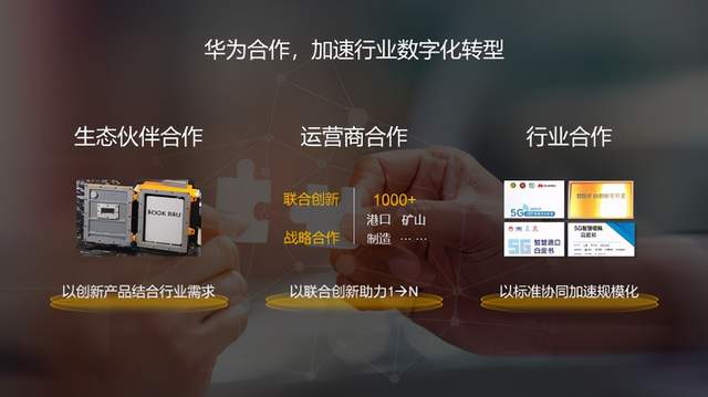 华为创新的另一个抓手就是合作。仍以5GtoB为例,我们一方面积极与各方伙伴合作,让华为的5G产品能够更好地满足不同行业场景的需求,如5G防爆基站可满足煤炭行业井下作业的需要。另一方面,我们与运营商积极合作,通过联合创新及战略合作形式,将5GtoB解决方案推广到各个行业,共同推进5GtoB 从1到N的规模复制,加速行业的数字化转型。