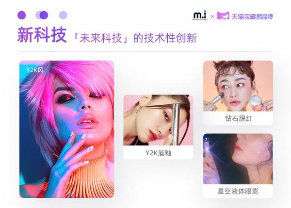 新科技影响美妆在技术创新和美学探索上不断向前延伸。护肤产品利用微生物技术提取对皮肤有益的微生物菌群,深度参与到人体的新陈代谢,加强肌肤机能,比如乳酸菌面膜等,又或者利用电解质帮助肌肤补充水分。与此同时,在美学潮流上Y2K风格再次兴起,通过色彩表达人类与科技的矛盾感来诠释未来科技高速发展下人的精神和生活状态。Y2K指千禧之年,代表着千禧年人们对未来科技天马行空的想象,在20年后的今天看来,有着一种复古的科幻感。在妆容上以高饱和度的配色,电光金属感,奇幻元素等增加科技感,受到学生和年轻人的喜爱。