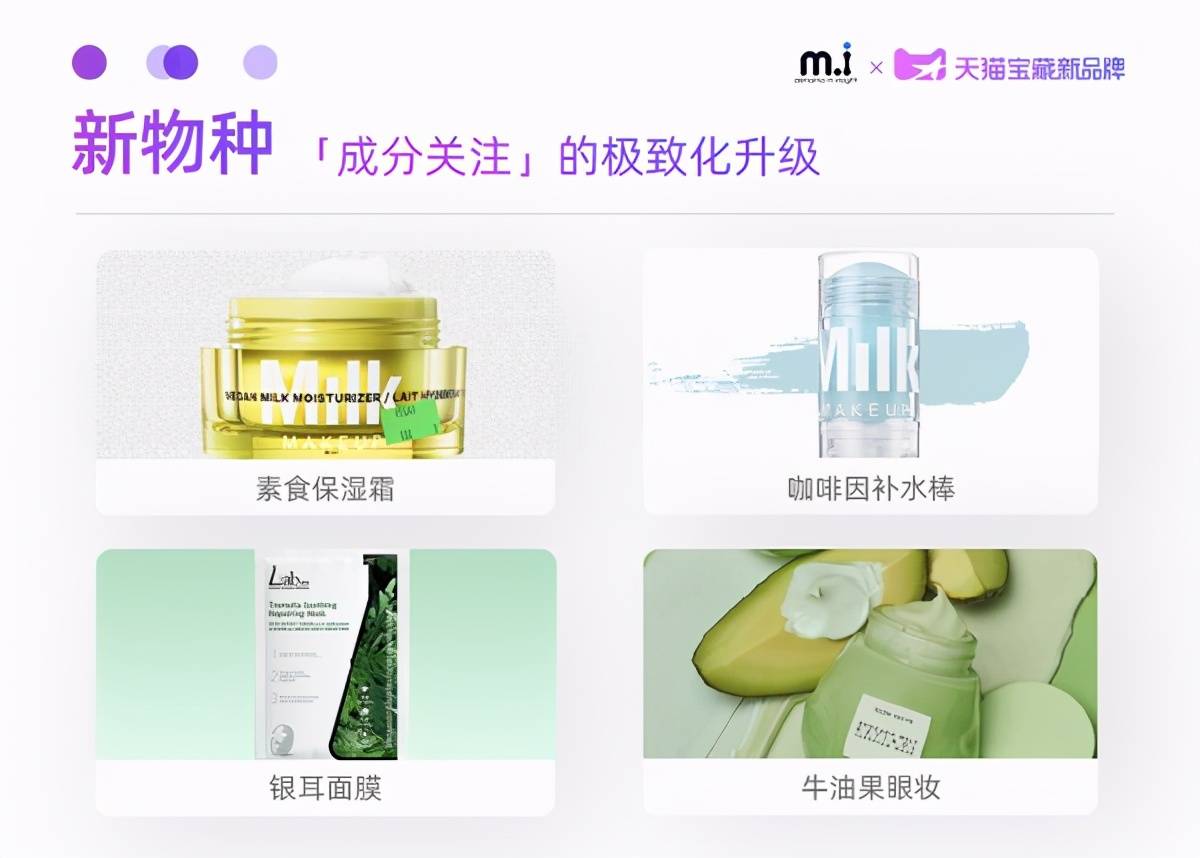 受新理念的影响开启了美妆新物种的创造,尤其是在食物中找寻“灵感”,食品用于美妆产品中以成分温和给消费者带来安全感。比如虾青素粉底液、银耳面膜、咖啡因补水棒等。更进一步,运用含有抗氧化成分的果蔬的“超级食妆”,比如牛油果眼妆、巴西莓身体乳、沙棘果面膜,帮助改善肌肤健康。另一种全新的美容理念“无水美容”浪潮被掀起,不含任何添加水成分的美妆产品正在席卷整个行业,被认为有效成分的纯净,并且能避免添加防腐剂。特别是近两年美妆行业对于消费者需求的关注已经延伸到生活方式和价值认同,为素食人群打造的“素食美妆”满足了这群人拒绝动物元素成分的产品需求,采用天然植物有机成分替代,并且逐渐出圈。