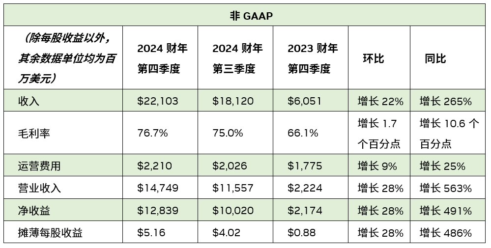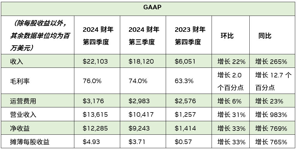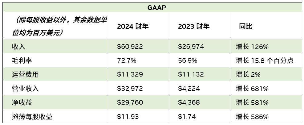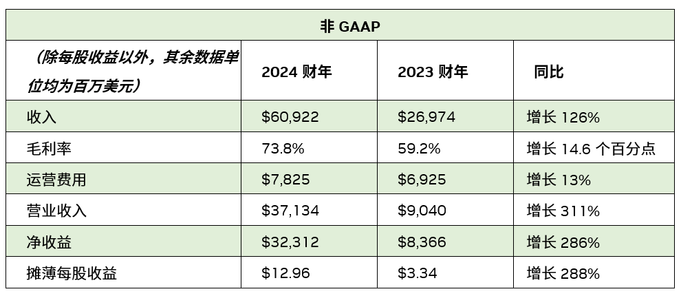 2024 财年收入增长 126%,达到 609 亿美元。全年 GAAP 摊薄每股收益为 11.93 美元,较上一财年增长 586%。全年非 GAAP 摊薄每股收益为 12.96 美元,较上一财年增长 288%。