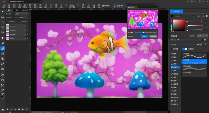 据刘昌伟介绍,“AI+设计”的理念是将人工智能技术与设计的思维及实践相结合,旨在通过AI绘画、新一代专业图像设计软件等数字工具优化设计流程、提升创新效率,并拓展创意边界。在作画和设计领域中,AI不仅可以辅助设计师进行快速原型制作、智能配色、素材推荐等工作,还能够根据用户行为预测绘画意图、个性化定制设计方案,甚至生成原创设计作品。