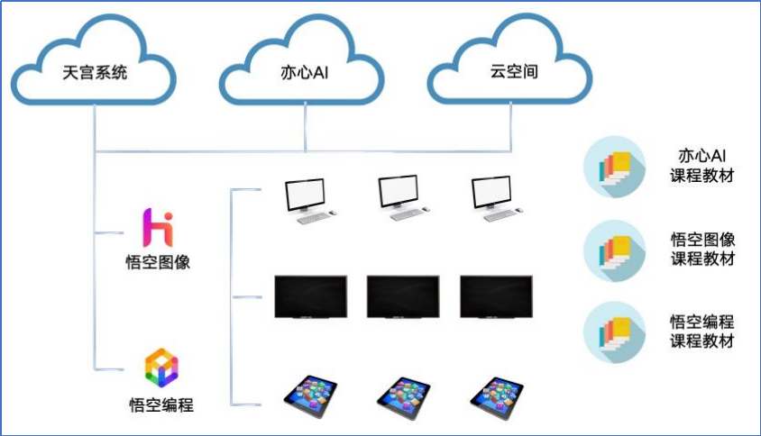 其中,天宫系统、云空间和亦心 AI 为云端系统,可直接使用亦心科技的公有云服务平台,也可以私有化部署给学校专用。悟空图像和悟空编程是终端应用软件。悟空图像包含 PC 端软件和PAD/手机端应用 App。可安装在个人电脑、智慧大屏黑板、PAD 或者手机上。悟空编程目前只有 PC 端应用软件,一般是安装在电教室的 PC 上。并且,这些软件也可以由学生自行下载安装在家里的电脑/PAD/手机上,作为课后自学、练习使用。方案同时还包含丰富的悟空图像教材课件和亦心 AI 教材课件,用于教学或者自学。