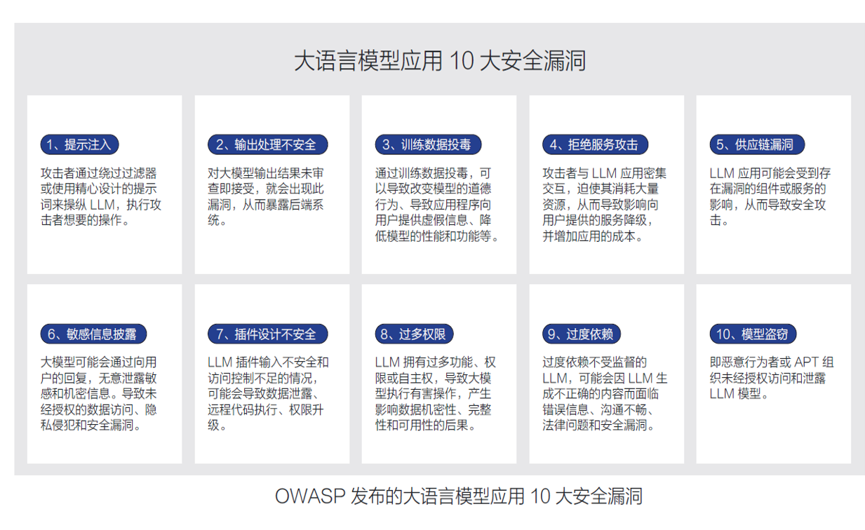 《报告》认为,AI与大语言模型本身伴随着安全风险,业内对潜在影响的研究与重视程度仍远远不足。全球知名应用安全组织OWASP发布大模型应用的十大安全风险,包括提示注入、数据泄漏、沙箱不足和未经授权的代码执行等。此外,因训练语料存在不良信息,导致生成的内容不安全,正持续引发灾难性的后果,危害国家安全,公共安全甚至个人安全,这些都亟需业内的高度重视和积极应对。