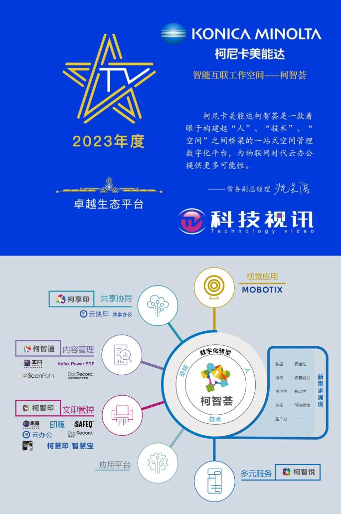 当下,随着越来越多的企业开始全面推进数字化办公、协同办公,为了更好地助力企业用户快速步入数字化转型的轨道,柯尼卡美能达倾力打造了智能互联工作空间——柯智荟。柯智荟是一个基于物理空间打造的一站式数字化管理平台,主要着眼于有效连接“人people”、“物thing”、“工作空间workplace”,涵盖文印管控、内容管理、共享协同、视觉应用及多元服务等六大领域,可充分满足企业用户个性化的商务办公需求。凭借创新的智慧型产品、一体化的商务解决方案和多元服务,柯智荟荣获科技视讯“2023年度卓越生态平台”大奖。