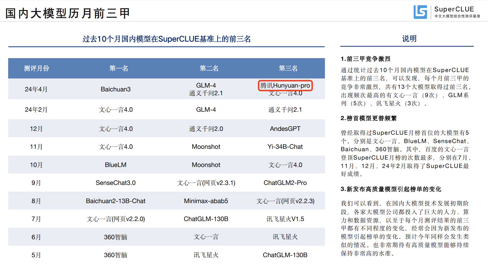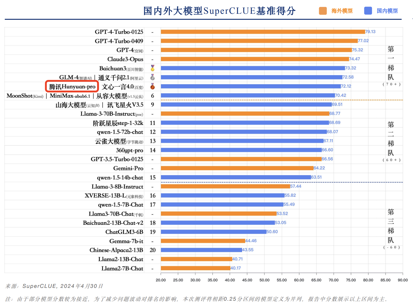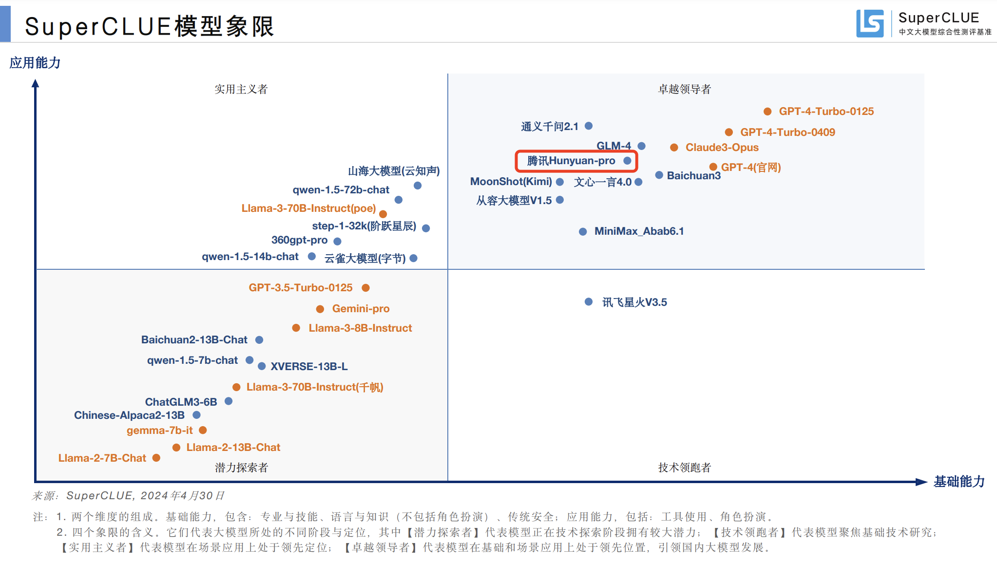 5月6日 记者获悉,国内权威的大模型评测机构SuperCLUE最新发布了《中文大模型基准测评2024年度4月报告》。其中,腾讯混元大模型位列国内大模型第一梯队,在基础和场景应用上均处于领先位置,位于卓越领导者象限。