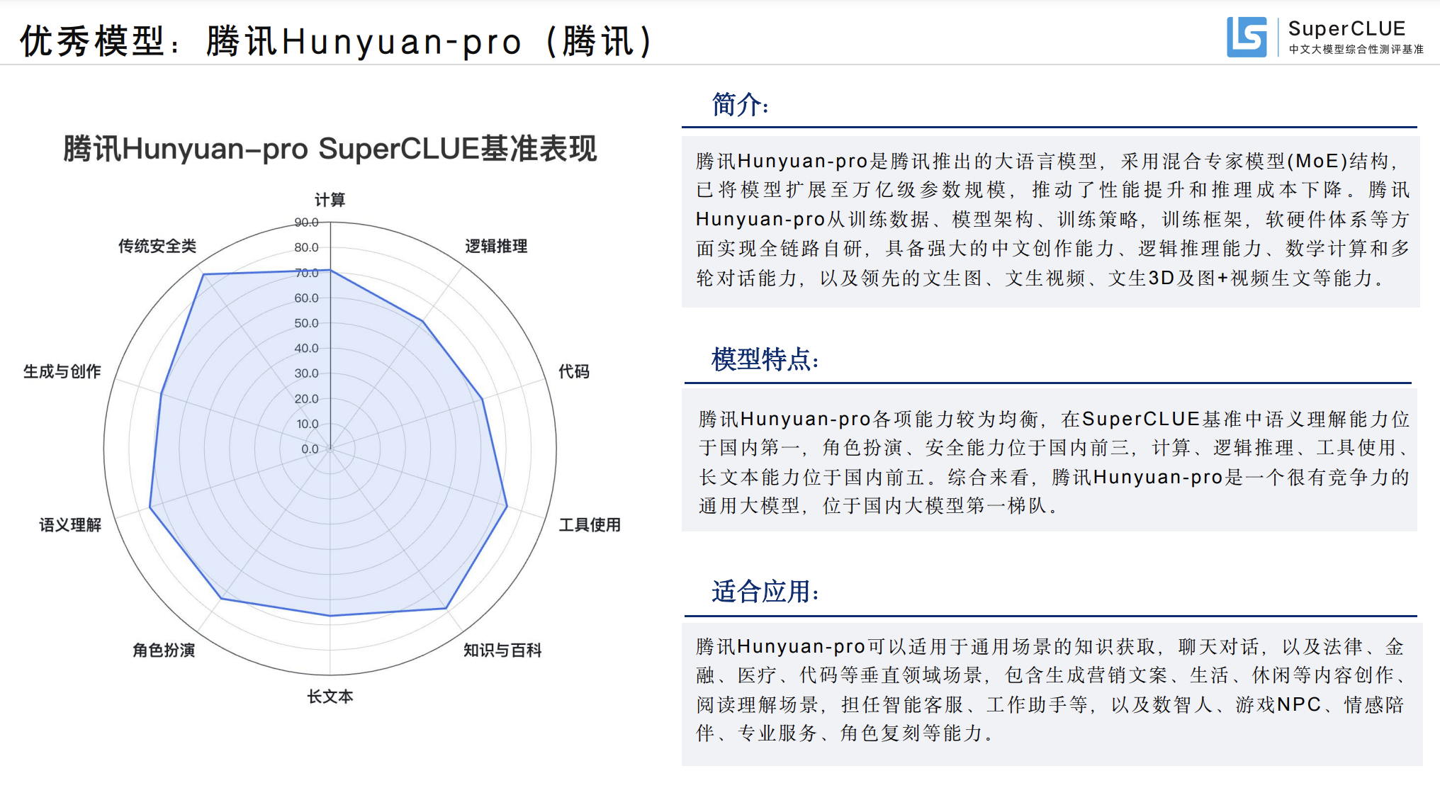 在十大能力得分中,腾讯混元大模型的各项能力较为均衡,在语义理解能力上,以75.4的高分排名国内第一;在角色扮演、安全能力、计算、逻辑推理、工具使用、长文本能力上,也均处于位于国内一流水平。