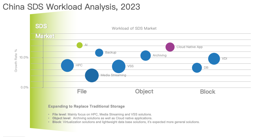 同时,我们也看到,SDS 的负载也出现了很多的变化。由于信创的驱动,SDS 在数据库(DB)场景开始逐步走向核心业务,很多金融企业在进行分布式核心系统的建设,SDS 块存储可以作为分布式核心数据库的主存储,SDS 文件存储可以作为核心数据库的备份目标存储,而 SDS 对象存储也是成本最低廉的核心数据库的数据归档和容灾存储。