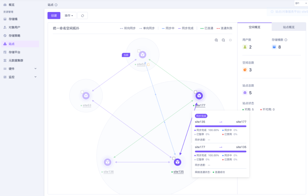 l 统一命名空间内所有站点的桶、用户信息将自动同步,无须手动在多个站点建立用户和桶;