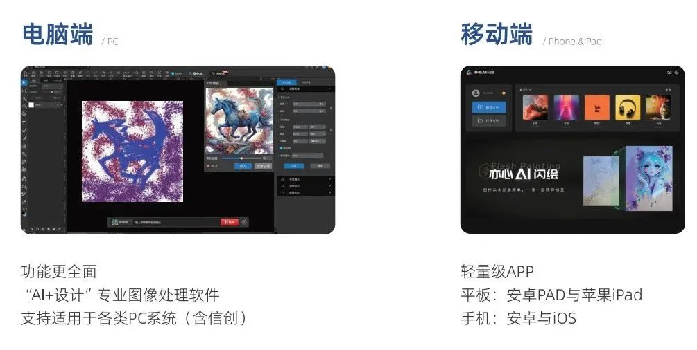 AI闪绘是亦心科技自主研发的专业AI实时绘画软件,支持适用各类PC系统(包含信创),同时针对移动端体验推出iPad与Pad轻量版本,适应便携式操作。