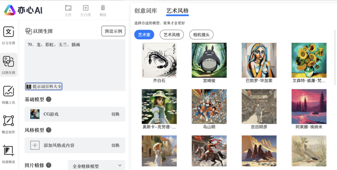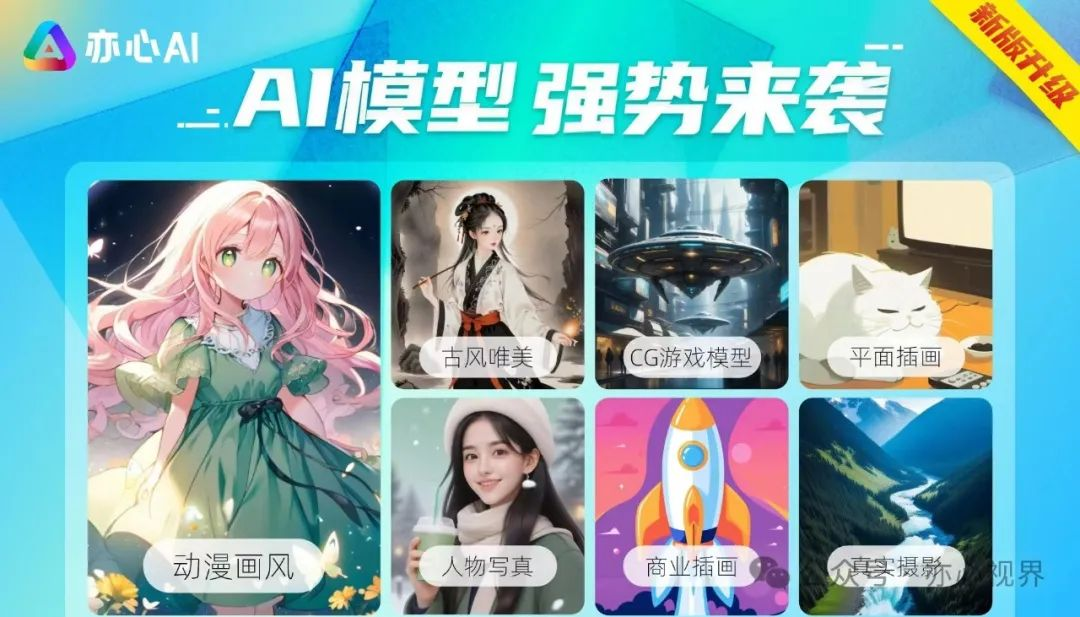 4月下旬,亦心科技还对CG游戏、真实摄影、人物写真、动漫画风、平面插画、商业插画、古风唯美等七大模型进行全面升级,增加更多风格小模型,为创作者激发灵感,带来多样化的视觉呈现。持续有序的迭代升级,优化提升性能,确保给用户带来更好的使用体验!